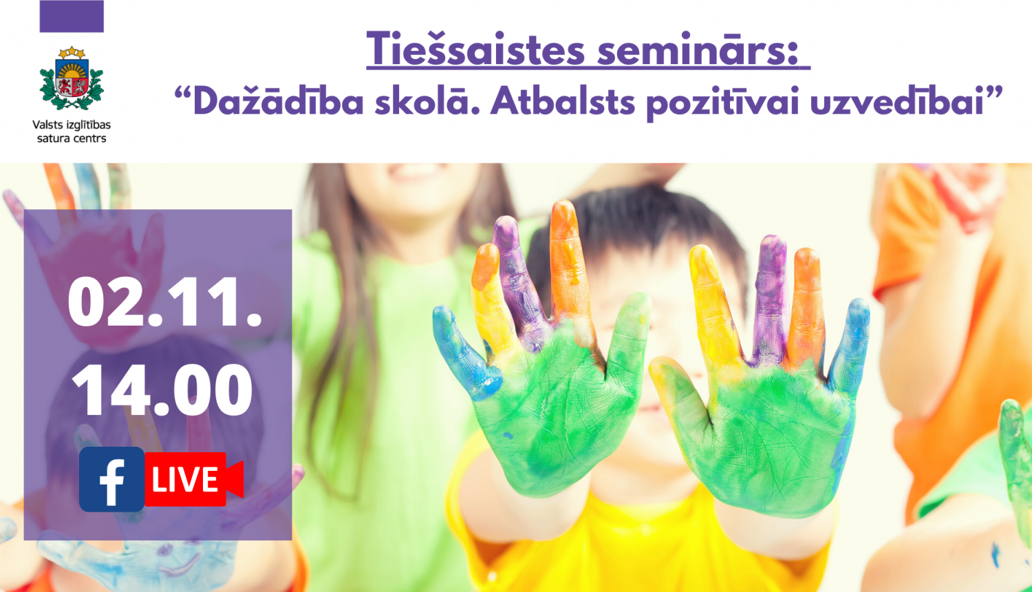 Aicinām 2023. gada 2. novembrī plkst. 14.00 piedalīties Valsts izglītības satura centra Iekļaujošās un speciālās izglītības nodaļas un Ozolnieku vidusskolas organizētā tiešsaistes seminārā “Dažādība skolā. Atbalsts pozitīvai uzvedībai”.