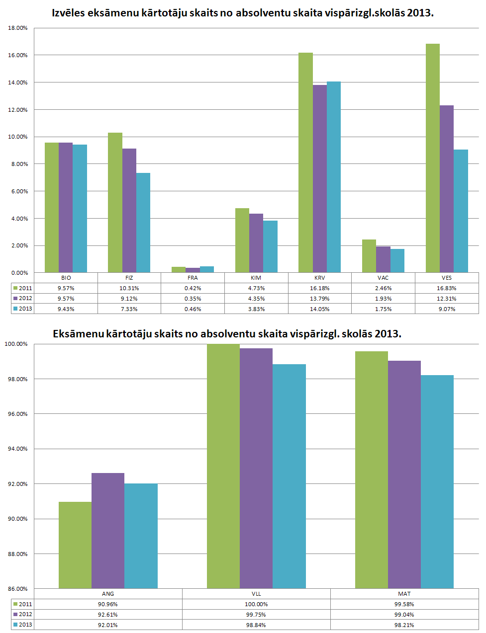 Vidējo sasniegumu analīzē tiek izmantoti katra skolēna iegūtais vērtējums pret maksimāli iespējamo attiecīgajā eksāmenā. Šie dati tiek izteikti % jeb kopprocentos. Uz sertifikāta tas tiek atspoguļots kā kopvērtējums. Piemēram, ja matemātikas 12.klases eksāmenā maksimālie punkti bija 80 un skolēns ieguva 65 punktus, tad kopprocents ir 81%. No šīm vērtībām arī tiek aprēķināts skolas vidējais un valsts vidējais vērtējums.